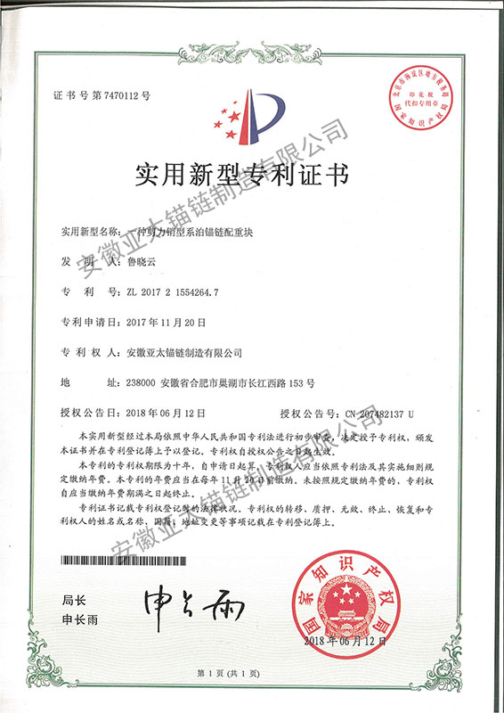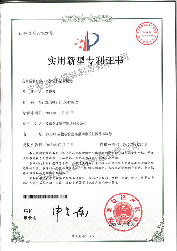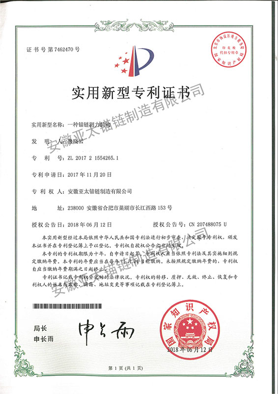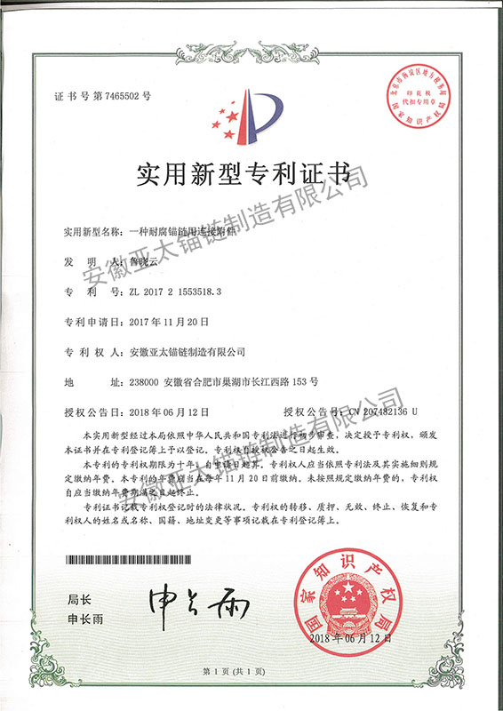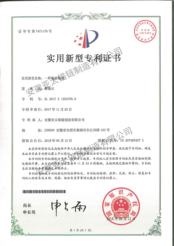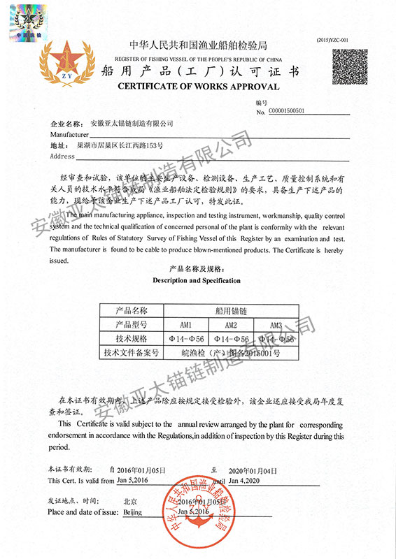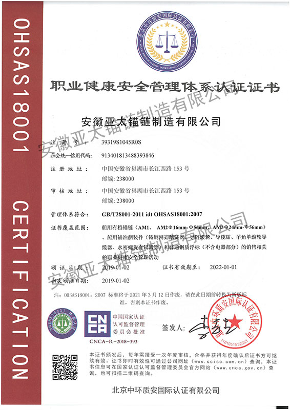 安徽亞太錨鏈制造有限公司是國家高新技術企業,也是國家GB/T 549-2017《電焊錨鏈》標準的起草和制定單位之一。公司旗下設有錨鏈分廠、浮標分廠、舾裝件分廠等多個分廠。公司專業從事φ12.5mm-φ107mm二、三級船用錨鏈、浮標錨鏈、錨鏈附件,錨、船舶曬裝產品、航標、系船浮、船型標、多種規格海洋監測浮標及航標燈等產品的生產、安裝和服務。目前公司的產品銷往全國各地船廠、碼頭、航標處、航道局、海洋局,并已走上國際市場,如東南亞、中東、歐美等國家。
